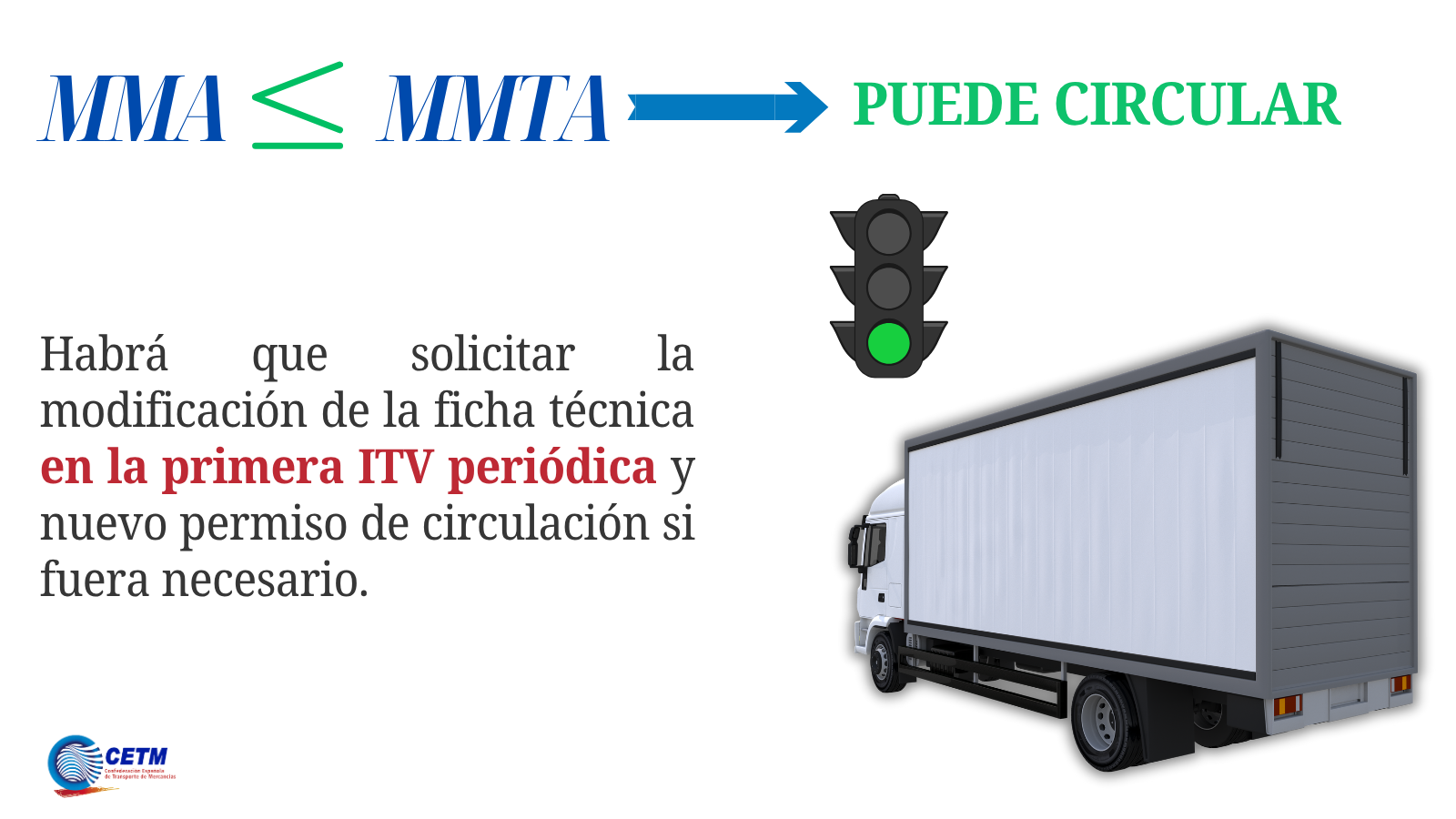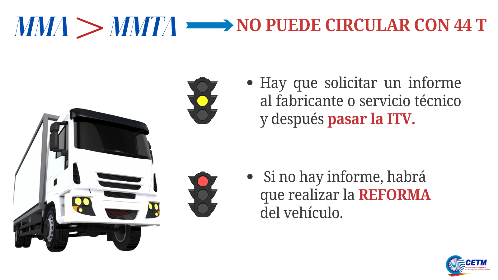 Si la nueva Masa Máxima Autorizada (44 toneladas) es igual o inferior a la MMTA que se indica en la tarjeta ITV, los vehículos podrán circular con las nuevas máximas autorizadas. Es decir, no habrá necesidad de modificar la ficha técnica hasta su primer paso por la ITV periódica, en la que el titular del vehículo deberá solicitarlo.