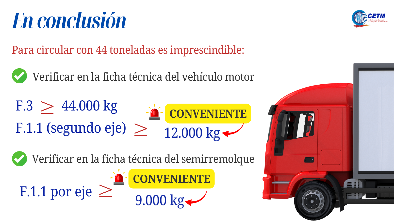 En estos casos, para que el vehículo pueda transportar las 44 toneladas se deberá contactar con el fabricante (o, si este ha desaparecido, con el servicio técnico que participó en su homologación) para que confirme si se pueden llevar o no.