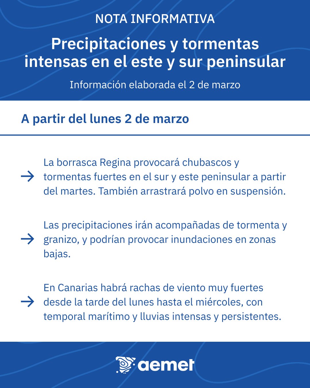 La Agencia Estatal de Meteorología (AEMET) ha emitido una nota informativa ante la llegada de una nueva borrasca, denominada Regina.