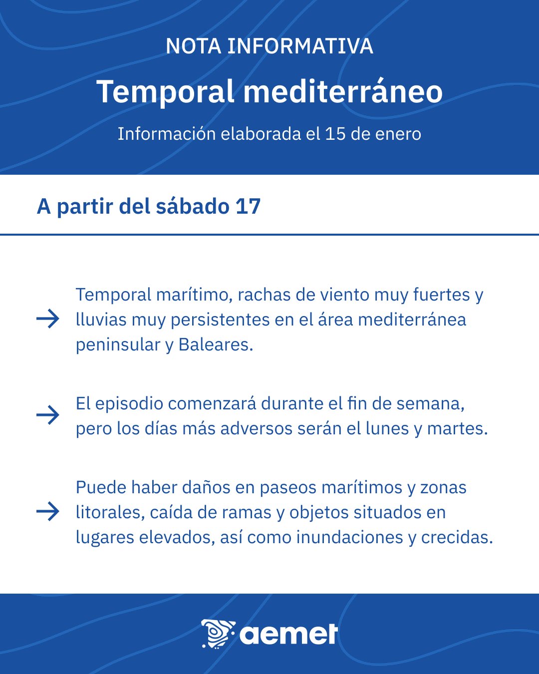 En combinación con el anticiclón europeo, se establecerá un intenso flujo del este muy húmedo sobre la mitad norte del área mediterránea peninsular y Baleares, lo que originará temporal marítimo y probables rachas muy fuertes, así como precipitaciones que pueden ser localmente fuertes y muy persistentes, especialmente en zonas del este y sur de Cataluña y de la Comunidad Valenciana. Con ello, es posible que se produzcan daños en paseos marítimos y zonas litorales, así como caídas de ramas o de árboles y de elementos arquitectónicos vulnerables o en mal estado. Las lluvias, además, pueden provocar crecidas fluviales e inundaciones locales, especialmente en zonas bajas.