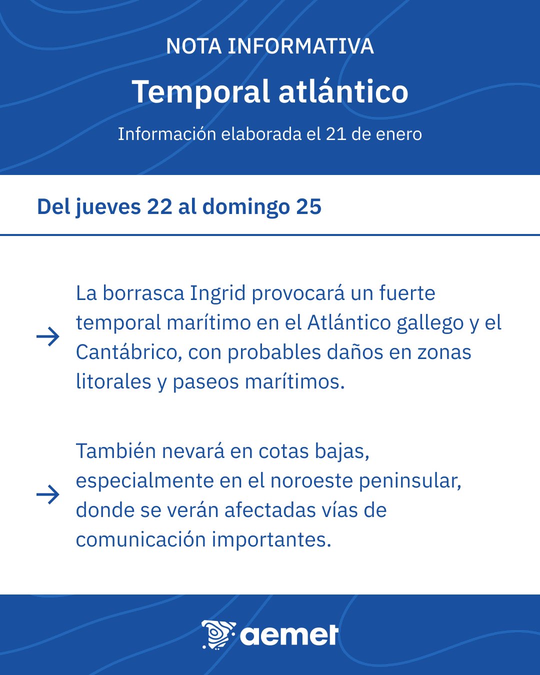 La Agencia Estatal de Meteorología (AEMET) ha emitido una nota informativa ante la llegada de la borrasca Ingrid: