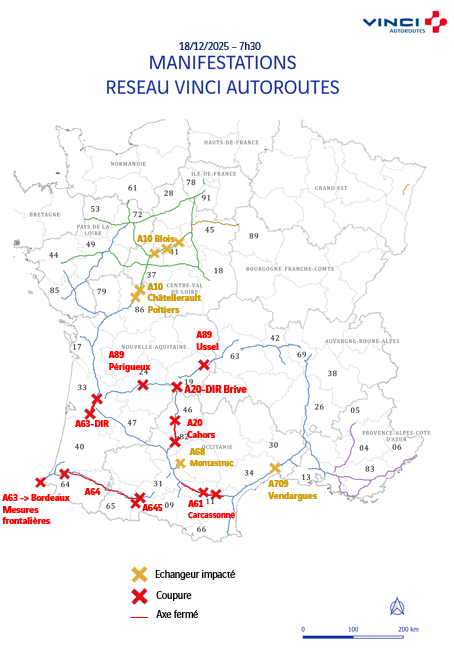 En este enlace se pueden consultar las medidas que están tomando las autoridades francesas para sortear los cortes: https://www.vinci-autoroutes.com/fr/actualites/services-et-aires/manifestations-agricoles-le-point-de-situation-du-18-decembre-6h15/
