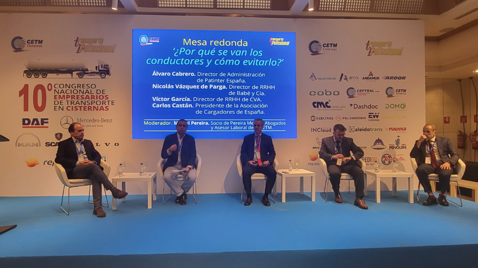 La última mesa del Congreso, moderada por Miguel Pereira, asesor laboral de la CETM, abordó uno de los principales retos del sector: la escasez de conductores. En ella participaron Álvaro Cabrero, director de Administración de Patinter España; Víctor García, director de RRHH de CVA; Carlos Castán, presidente de la Asociación de Cargadores de España; y Nicolás Vázquez de Parga, director de RRHH de Babé y Cía.