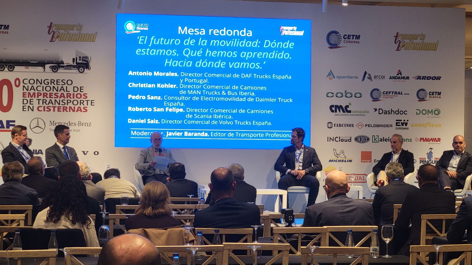 En esta mesa, moderada por Javier Baranda, editor de Transporte Profesional, participaron Roberto San Felipe, director comercial de Camiones de Scania Ibérica; Pedro Sanz, consultor de Electromovilidad de Daimler Truck España; Daniel Saiz, director comercial de Volvo Trucks España; Christian Kohler, director comercial de Camiones de MAN Truck & Bus Iberia; y Antonio Morales, director general de DAF Trucks España y Portugal.